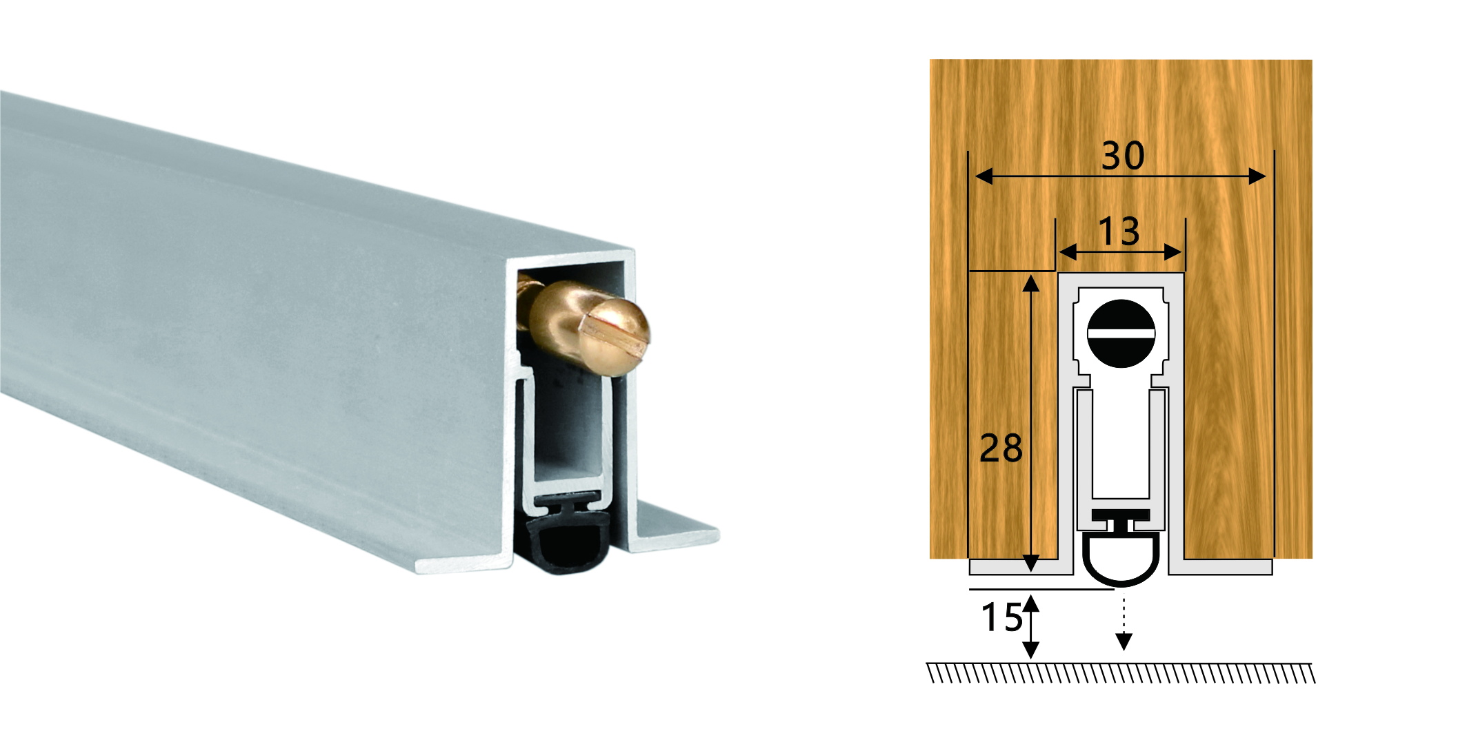 嵌入式門底自動升降式密封器,四連桿機構,適用于門扇內開槽的門。安裝時需在門底有一個28mm*13mm的通槽,將產品放置其中,將兩端蓋板和密封器用螺 絲固定(或用螺絲從密封條底部向上固定),使用本產品不影響門的整體風格。