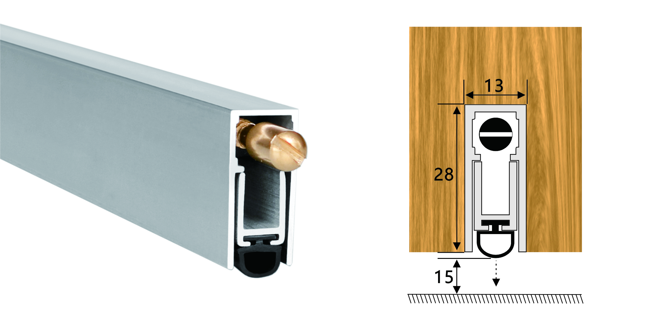 嵌入式門底自動升降式密封器,四連桿機構,適用于門扇內開槽的門。安裝時需在門底有一個28mm*13mm的通槽,將產品放置其中,將兩端蓋板和密封器用螺絲固定(或用螺絲從密封條底部向上固定),使用本產品不影響門的整體風格。