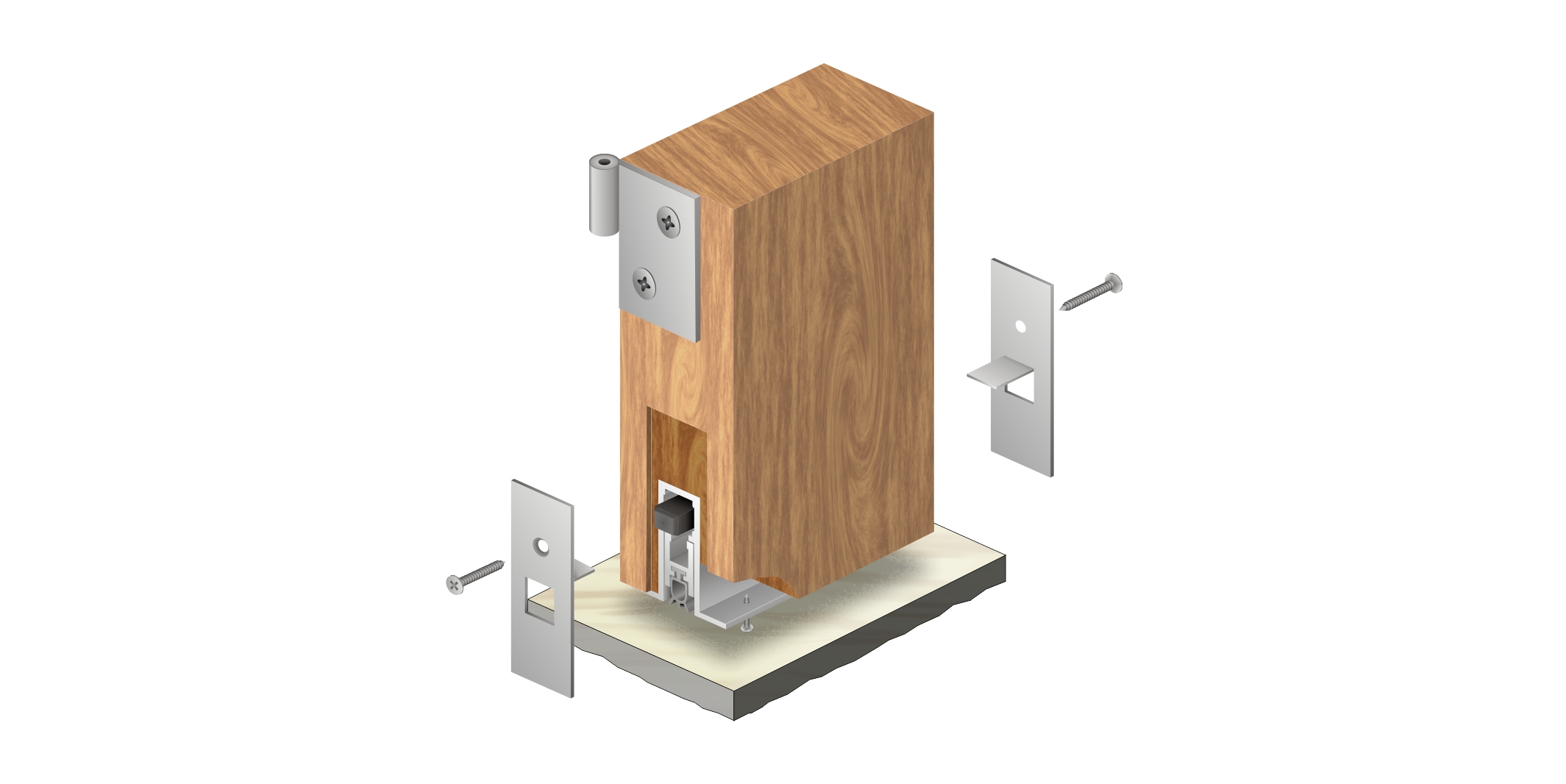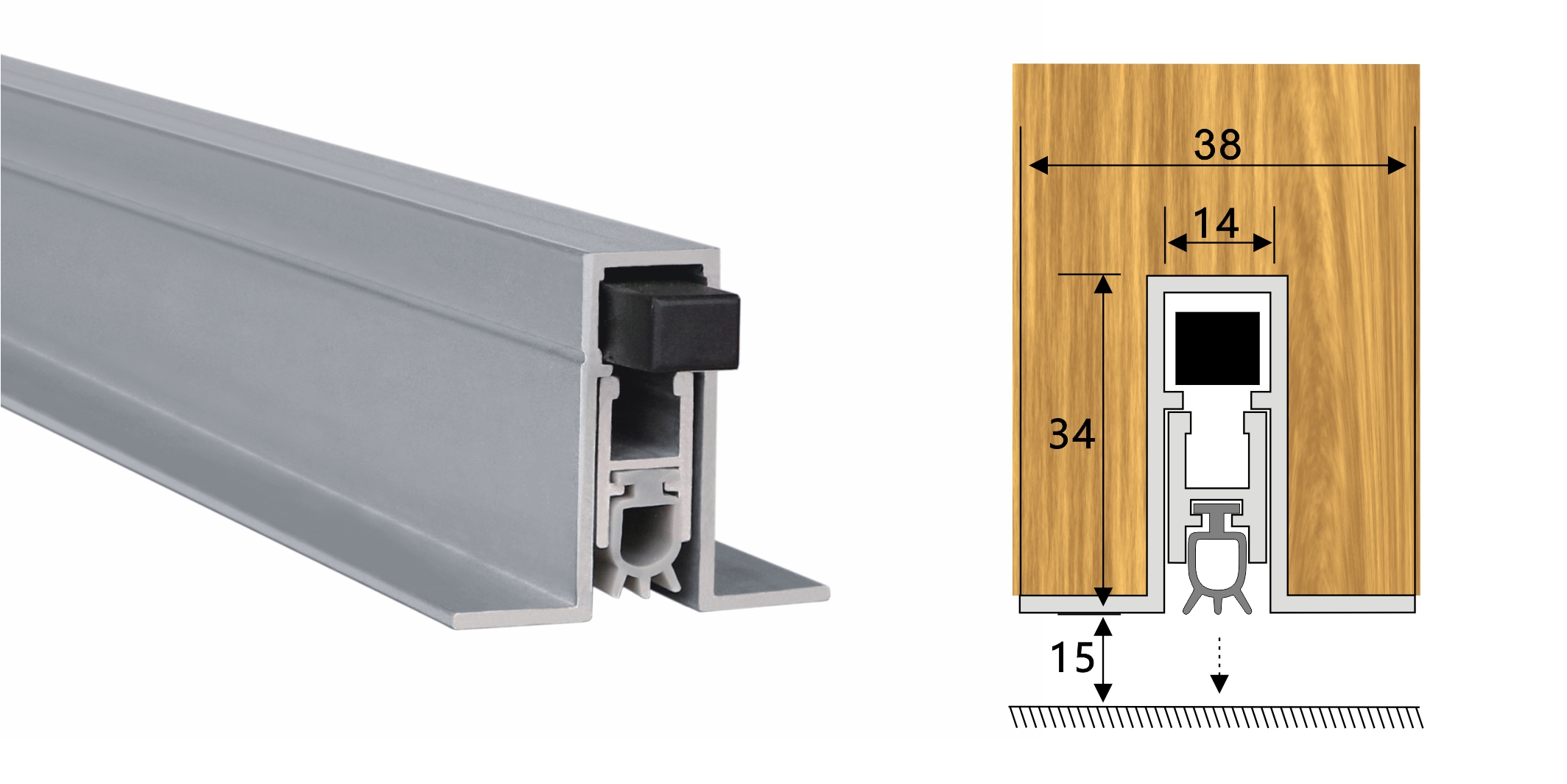 嵌入式門底自動升降式密封器,M型彈簧結構,適用于門扇內開槽的門。安裝時需在門底有一個34mm*14mm的通槽,將產品放置其中,從產品的翼上固定,并將裝飾端蓋板用螺絲裝上,使用本產品不影響門的整體風格。